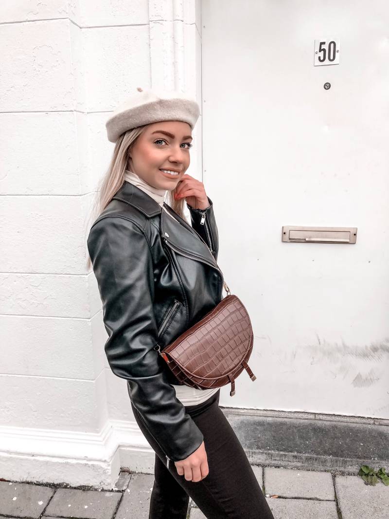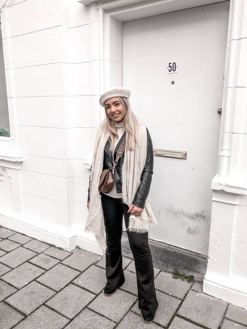 Het eerste lookje is een basic outfit die perfect is voor elke gelegenheid. Deze kleurencombinatie is een van mijn favorieten voor dit seizoen. Omdat deze outfit basic is, vind ik het altijd leuk om accessoires toe te voegen. De coltrui heb ik daarom gecombineerd met een laagjes ketting en een horloge van Rosefield. Om deze look autumn en winter ready te maken, heb ik een mooie barette met bijpassende sjaal toegevoegd. Deze items passen perfect bij de kleur van de coltrui. De coltrui en flaired broek zijn van Sansonline. Sansonline heeft u ook sale op vrouwenkleding, so be fast! Als jas heb ik gekozen voor een leren jasje, 'you can never go wrong with a leather jacket.' Onder deze outfit draag ik de Isabel Marant Bobby sneakers in de kleur zwart. Het tasje heeft een slangenprint structuur met gouden details en is ook een echte eyecatcher voor deze outfit. De vorm vind ik erg uniek en hij is perfect om schuin om te hangen.