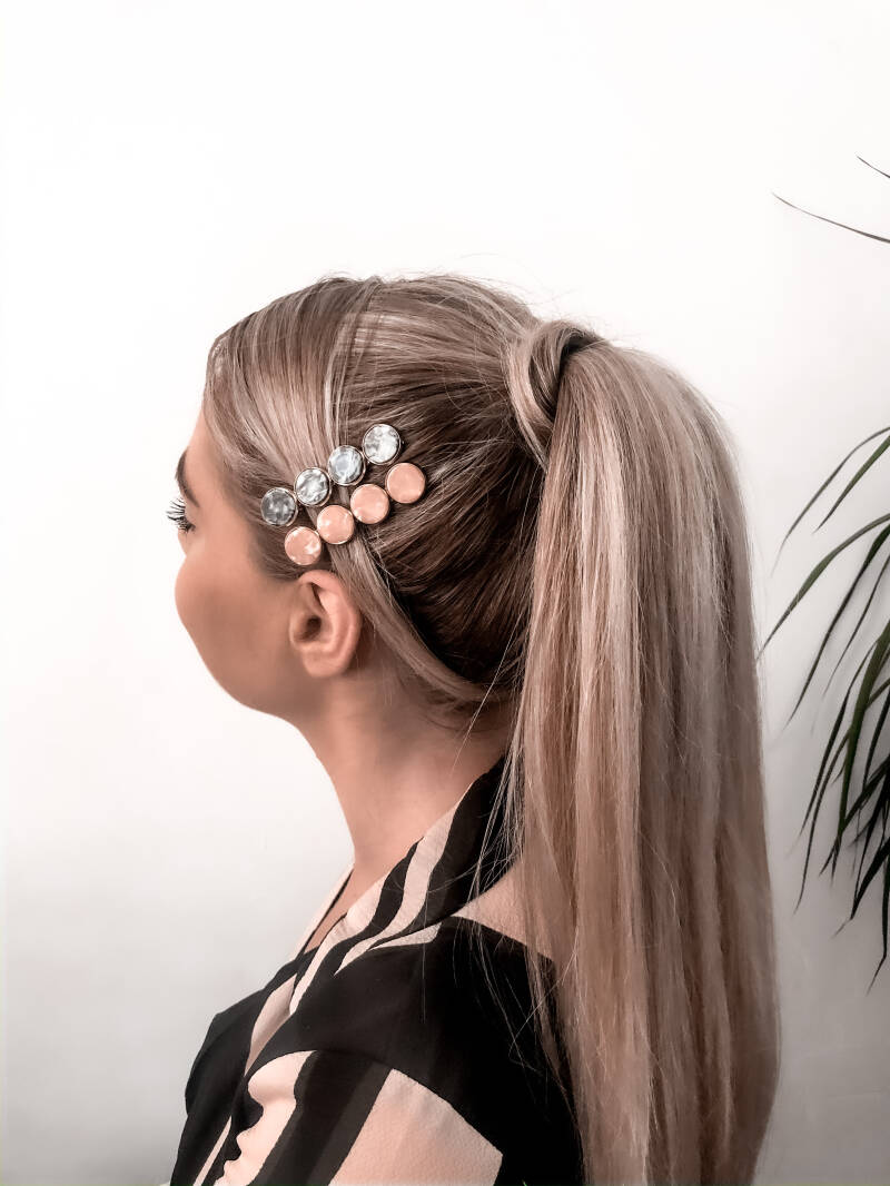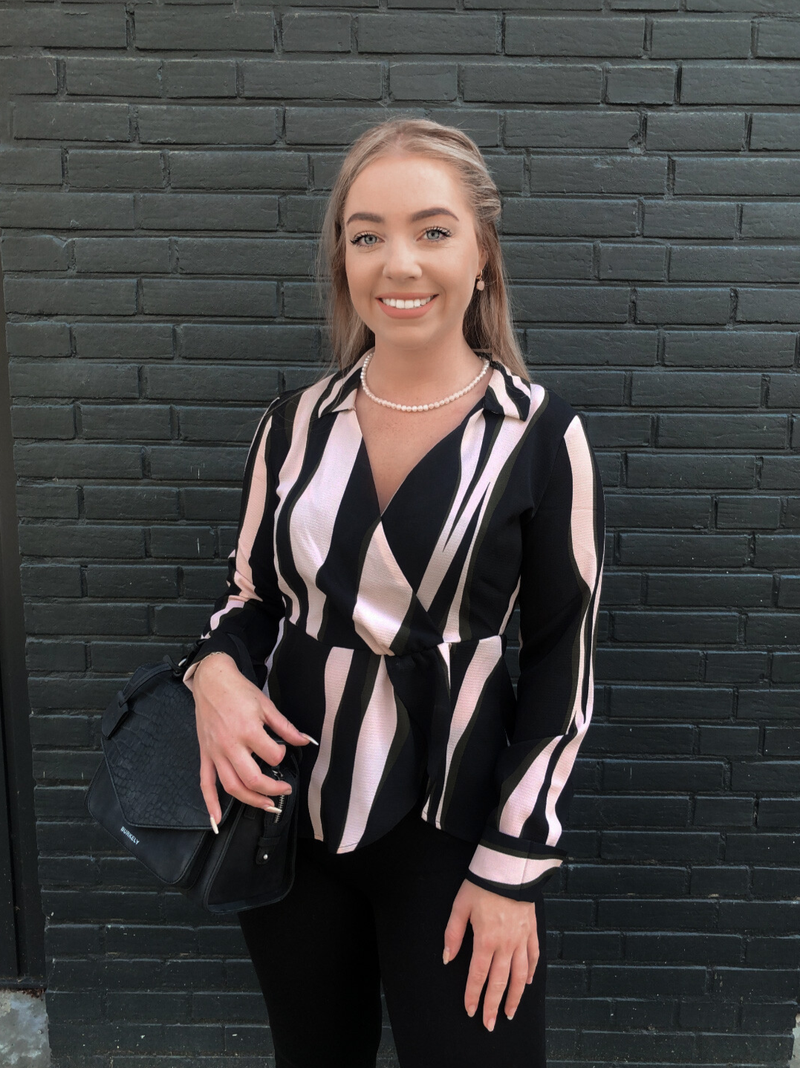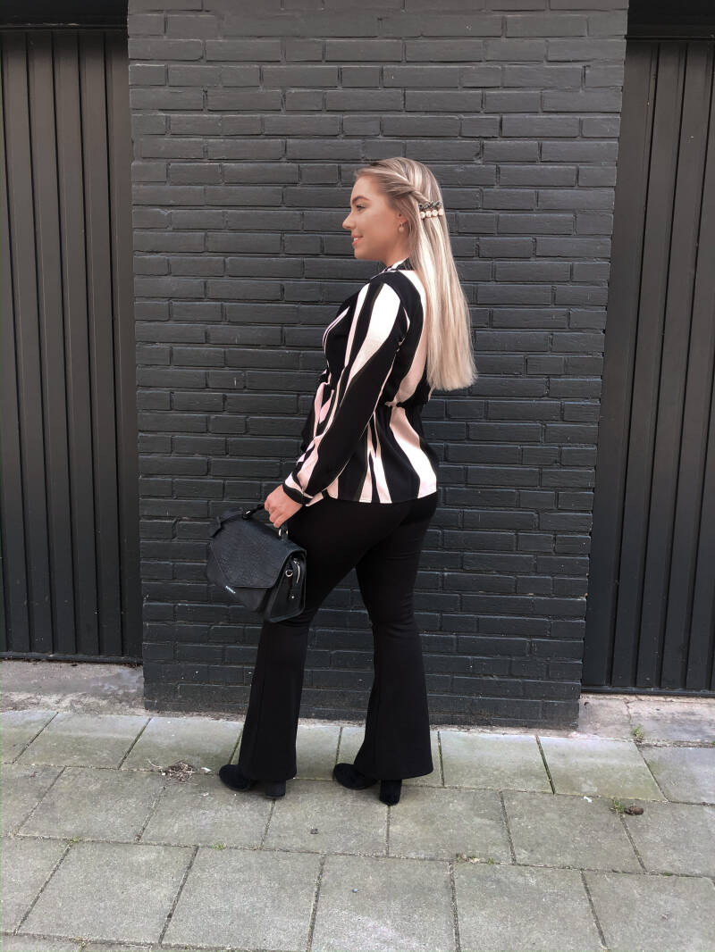 De tweede outfit die ik gekozen heb, is een outfit met een flared broek (Only) in combinatie met een blouse met print (Vero Moda). Printjes zijn normaal niet helemaal mijn ding, maar toen ik deze blouse zag was ik op slag verliefd! Het is een subtiele en vrouwelijke blouse met een mooie kleurencombinatie. De top is gemaakt van een super prettig materiaal en zit heerlijk. Het is een echte musthave voor je kledingkast! Deze top heb ik gecombineerd met een flared broek, omdat de top ook een wijde, uitlopende look heeft aan de onderkant. De broek is gemaakt van een super zacht en fijn materiaal waarin je goed kunt bewegen. Bij het zitten, zit hij ook perfect. Bij deze outfit draag ik mijn favoriete velvet laarsjes met een hak. Als finishing touch heb ik sieraden toegevoegd. Ik heb gekozen voor een parelketting, omdat dit mooi past bij de kleuren uit de print van de top. Ook heb ik bij deze outfit een finishing touch in mijn haar toegevoegd. In mijn haar heb ik mooie haarclips en zoals je kunt zien op de foto, is het leuk om verschillende haarstijlen uit te proberen. De kleuren van de haarclips komen ook terug in de kleuren van de top. Hoe leuk is dat!