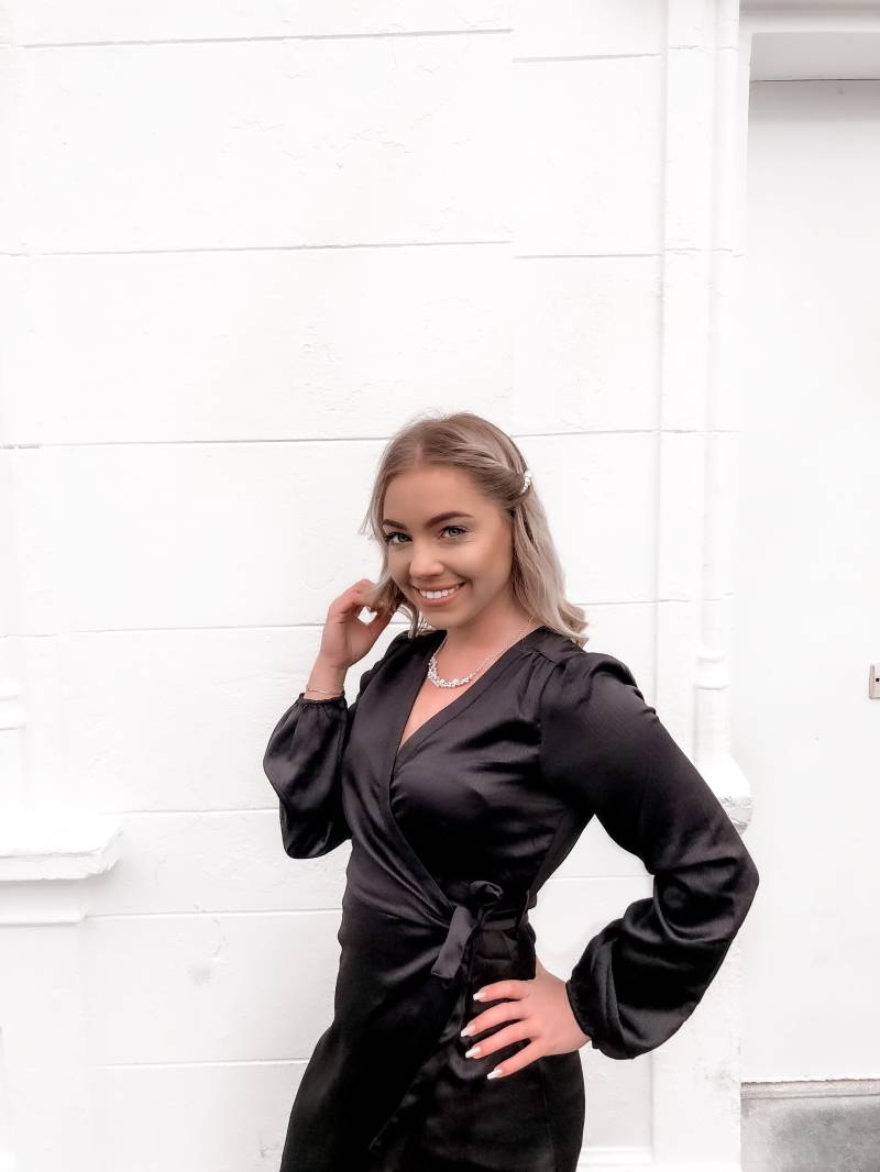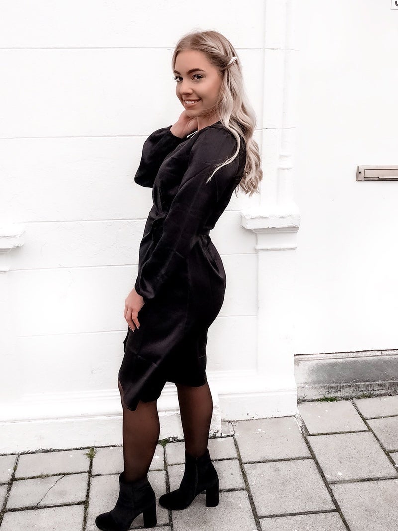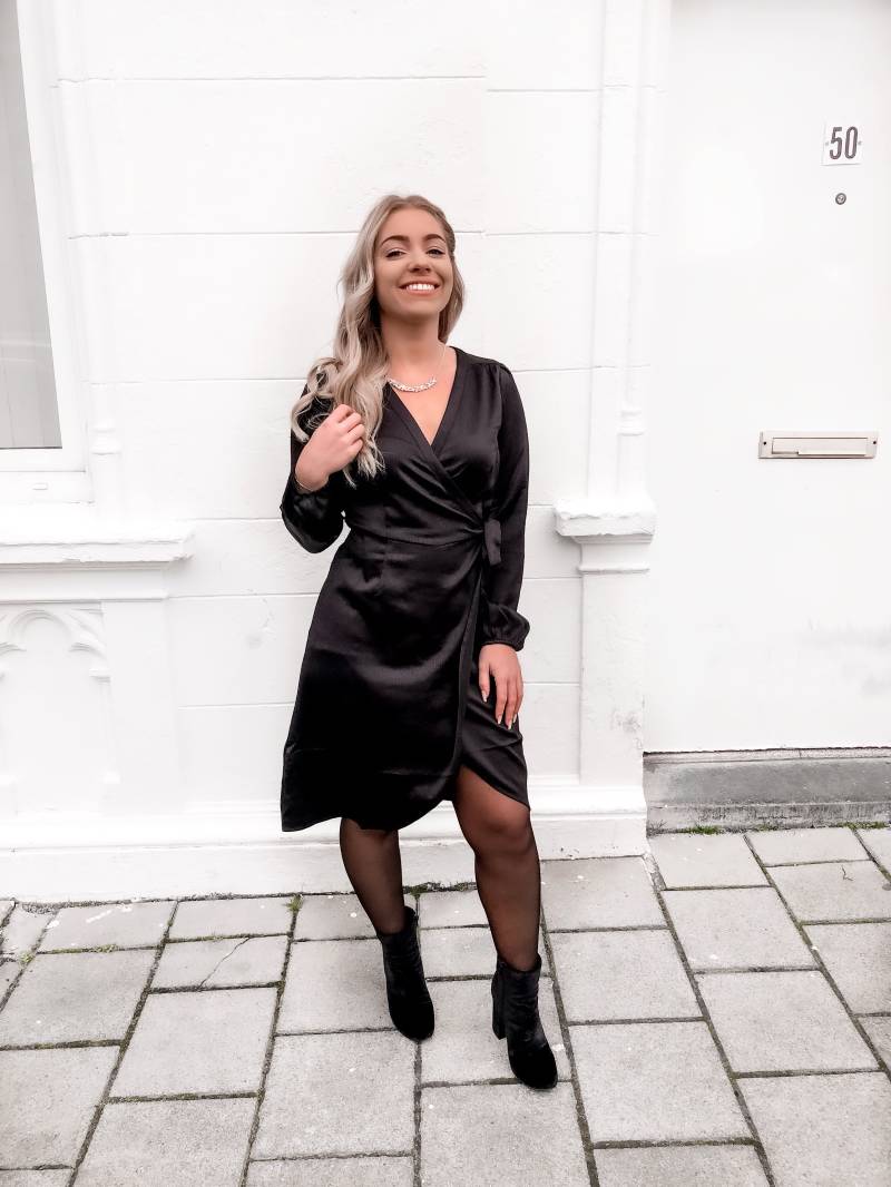 Black is my happy color! Omdat ik veel zwart draag, vind ik het altijd leuk om zwarte items in verschillende stofjes te kiezen. De stof van een item bepaalt in grote mate de stijl die het item uitstraalt. De jurk (Vero Moda) die ik gekozen heb is gemaakt van een soort satijnen stofje, en geeft de jurk een chique effect. Doordat de jurk aan de zijkant gestrikt wordt, sluit het mooi aan in de taille en accentueert het je figuur goed. De jurk heeft een mooie v-hals die ik gecombineerd heb met een zilveren statement ketting. Ik heb gekozen voor een zilveren ketting met diamantjes, om er een extra feestelijke look aan te geven. Deze jurk heb ik gecombineerd met velvet enkellaarsjes met een hak! Je kunt het ook dragen met een mooie chique open sandaal hak of klassieke zwarte schoenen. Mijn haar heb ik aan één kant vastgezet met een parelspeld. De parelspeld past mooi bij de classy look en is erg subtiel. Haren in de krul en je bent ready to go!